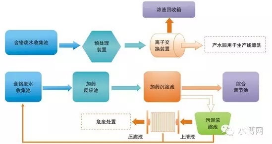 ③含铬废水中的铬离子属一类污染物,必须单独收集处理,并充分考虑铬的回收利用。其中,含铬废水槽边回收采用离子交换树脂吸附工艺,残余六价铬的毒性极强,危险性极大,必须将六价格还原为三价铬沉淀后,可与其它重金属废水混合处理。